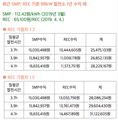 제공하는 2019년 3월 SMP와 최근 REC 가격으로 수익 계산한 결과입니다.
