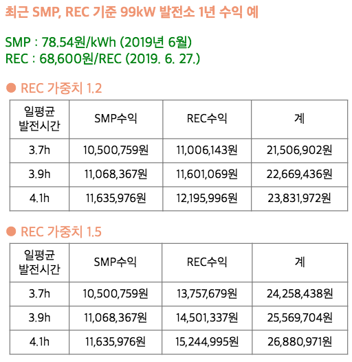 제공하는 2019년 6월 SMP와 최근 REC 가격으로 수익 계산한 결과입니다.