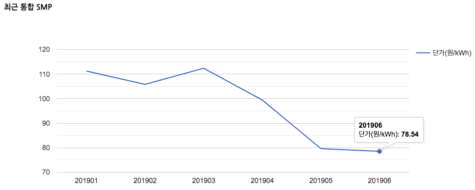 SMP 2019년 3월 가중 평균가는 78.54원/kWh 입니다.