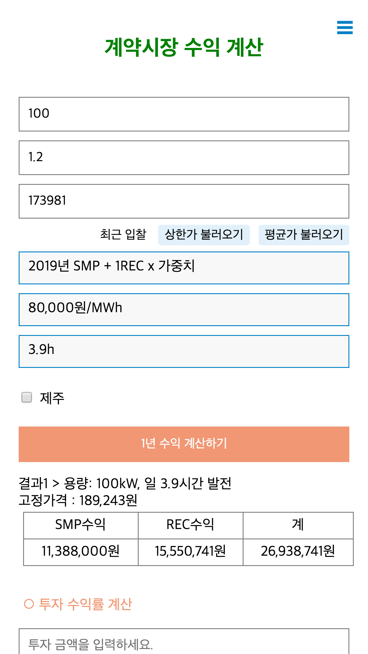 용량 99kW, REC 가중치 1.2, 일평균 발전시간 3.9시간으로