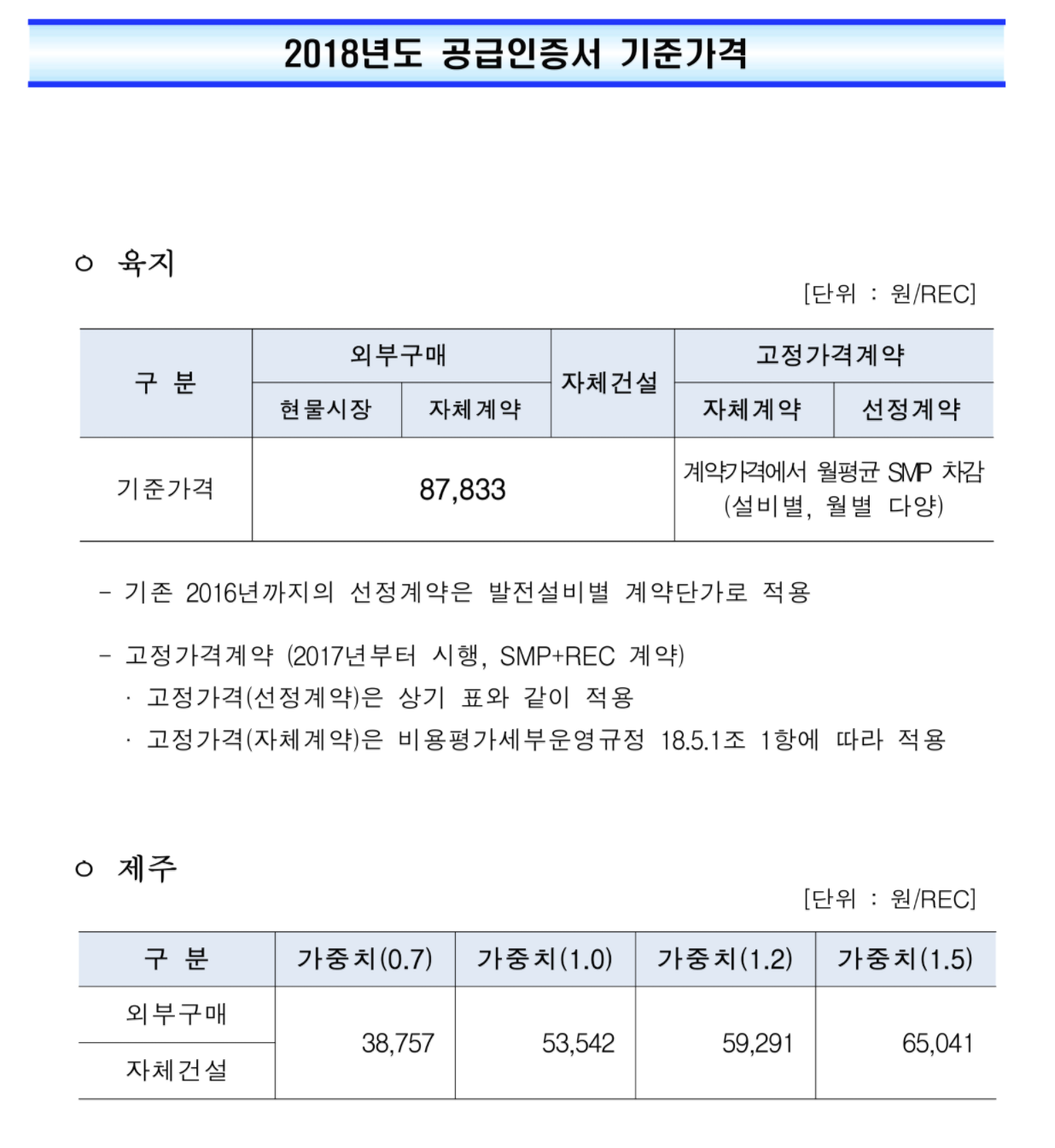 2018년도 REC(신재생에너지공급인증서) 기준가격이 발표되었습니다.
