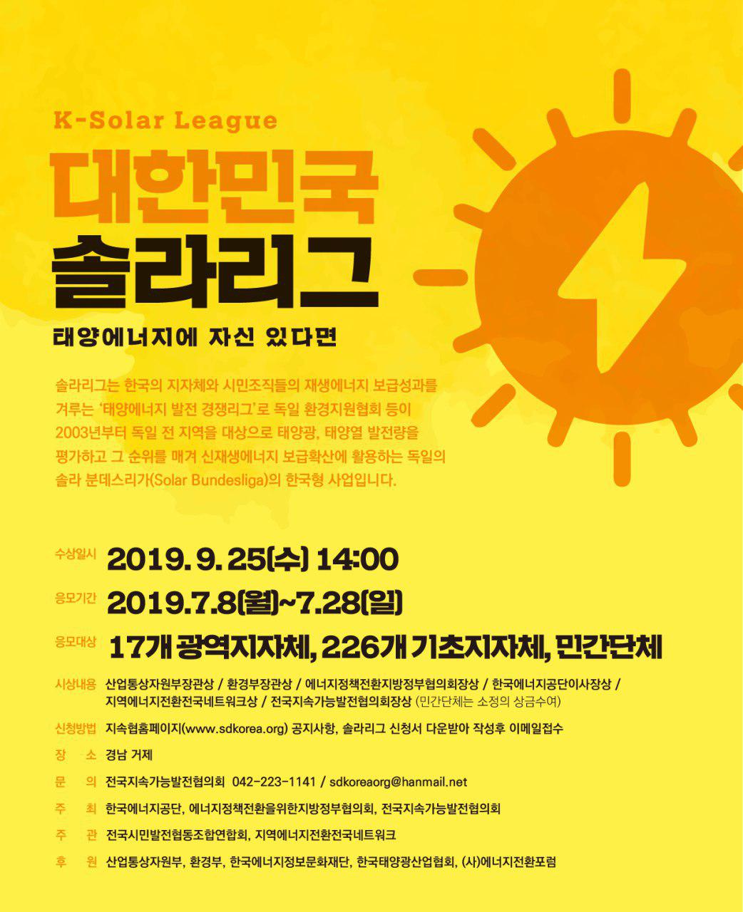 제1회 대한민국 솔라리그(K-Solar League) 정부의 에너지전환 정책에 따라 지역에너지전환에 기여하고, 미세먼지 문제와 기후변화에 대응하기 위해 재생에너지 확대와 태양광 발전 보급에 앞장선 모범사례를 발굴, 시상하고자 추진함. ㅇ 사업개요 – 행사명: 대한민국-솔라리그, K-Solar League – 신청대상: 17개 광역자치단체, 226개 기초자치단체, 민간단체 – 시상내역: 산업통상자원부장관상, 환경부장관상 등 민간부분은 소정의 상금 수