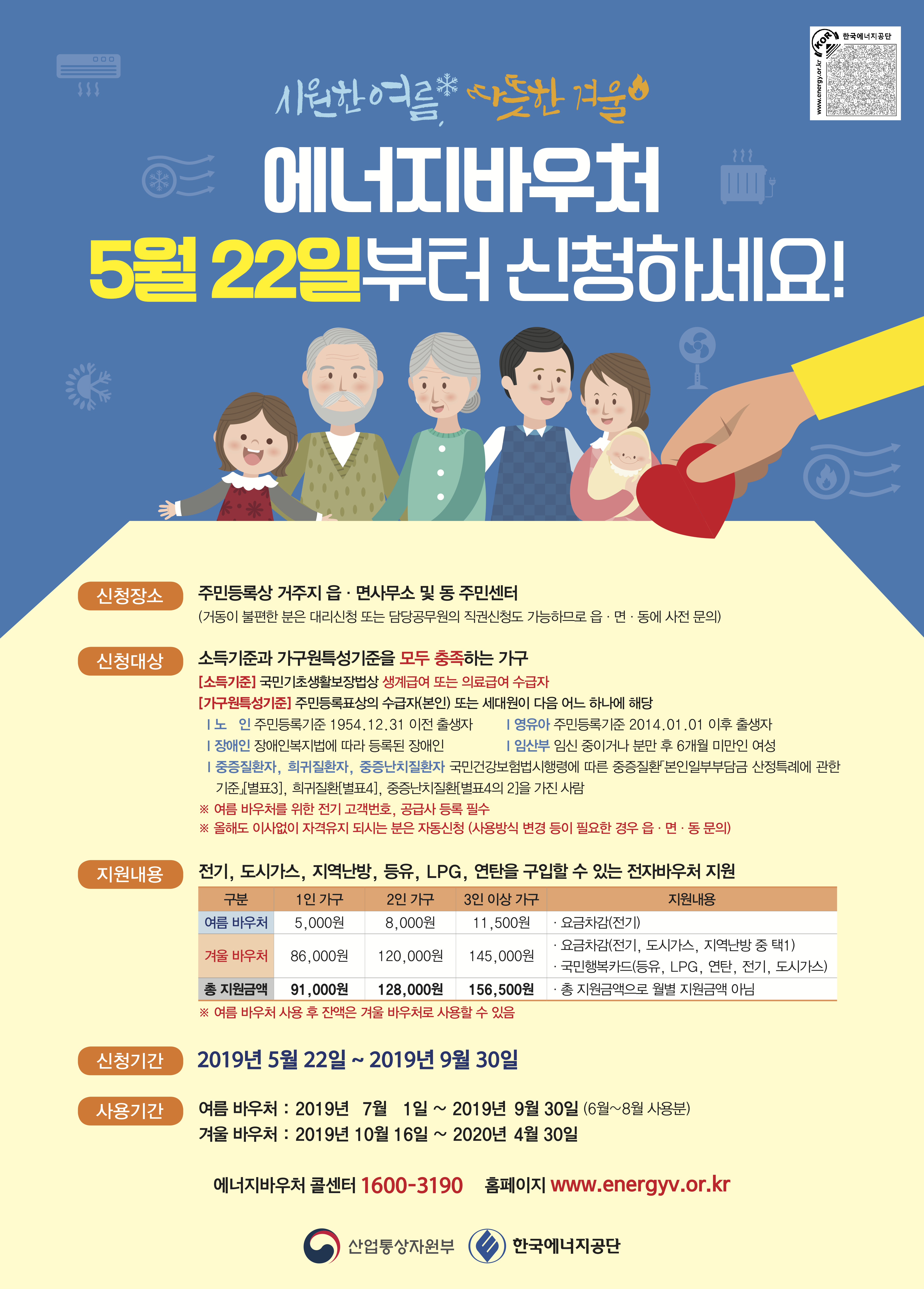 올해 에너지바우처 대상자 확대 지원 - 생계·의료급여 수급자 중 중증·희귀난치성질환자가 있는 가구도 지원, 접수는 10월 17일(수)부터 시작 - 한국에너지공단(이사장 직무대행 이상홍)은 취약계..