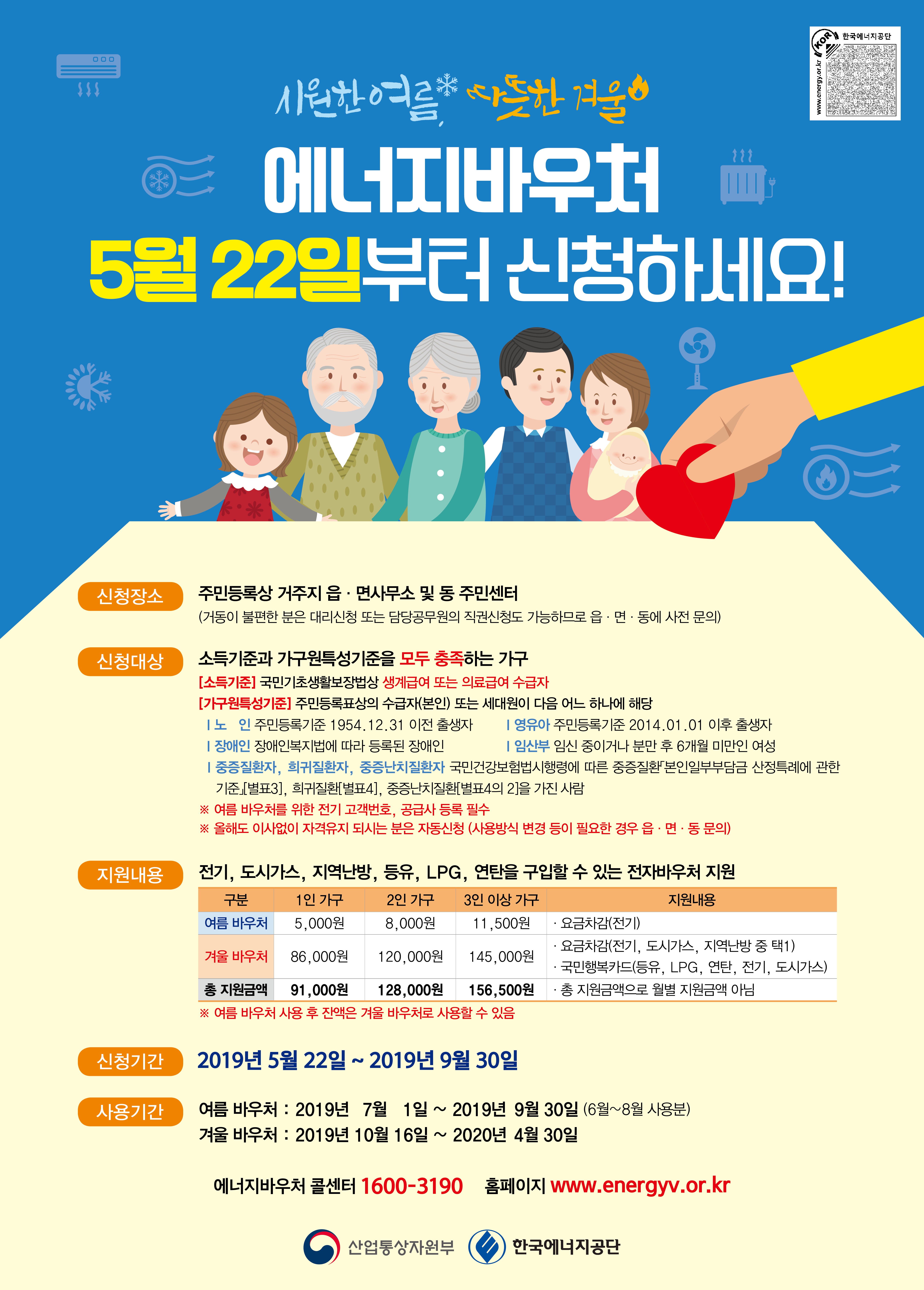 국민 모두가 시원한 여름, 따뜻한 겨울을 보낼 수 있도록에너지 취약계층을 위해 에너지바우처(이용권)을 지급하여 전기, 도시가스, 지역난방, 등유, LPG, 연탄 을 구입할 수 있도록 지원하는 제도