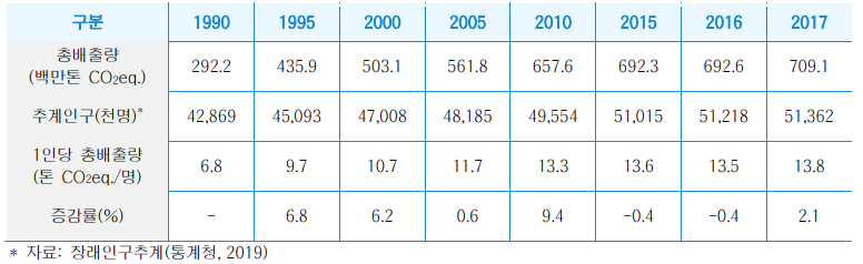 우리나라 2017년 온실가스 2016년 대비 2.4% 증가한 (1990년 대비 142.7% 증가) 709.1 백만톤 CO2eq