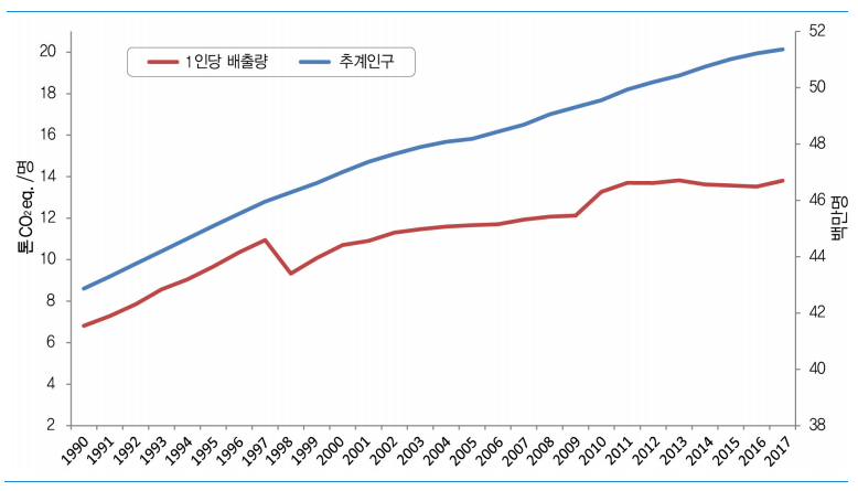 2017년 우리나라의 인구 1인당 온실가스 총배출량은 13.8 톤 CO2eq.으로 1990년 대비 102.6% 증가 하였다. 1인당 온실가스 배출량이 증가한 이유는 인구 증가보다 산업발달에 따른 온실가스 배출량 증가가 컸기 때문이다. 1990-2017년 온실가스 배출량 증가율은 142.7%로 인구 증가율 19.8%를 크게 상회하였으며, 결과적으로 같은 기간 1인당 온실가스 배출량은 102.6% 증가하였다