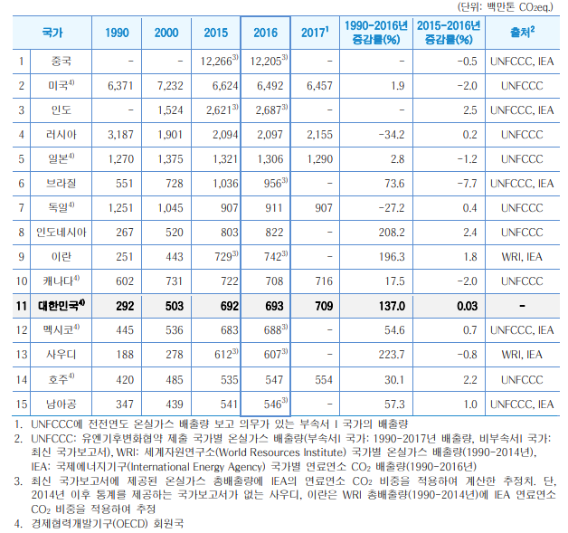 우리나라의 2016년 온실가스 총배출량을 UNFCCC 부속서 I 국가들과 비교하면 미국, 러시아, 일본, 독일, 캐나다에 이어 6위이며, 비부속서 I 국가들을 포함할 경우 11위에 해당한다. 36개 경제협력 개발기구(OECD, Organization for Economic Cooperation and Development) 회원국 중에서는 미국, 일본, 독일, 캐나다에 이어 5위인 것으로 추정되었다.