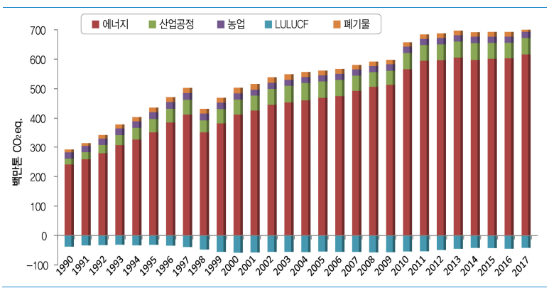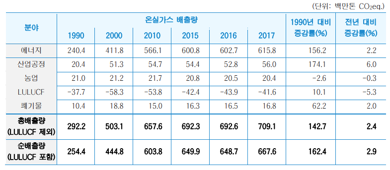 우리나라의 2017년 온실가스 총배출량1 은 709.1 백만톤 CO2eq.이며, 1990년도 총배출량 292.2 백만톤 CO2eq.에 비해 142.7% 증가하였고 2016년도 총배출량인 692.6 백만톤 CO2eq.보다 2.4% 증가하였다. 분야별로는 에너지 분야에서 615.8 백만톤 CO2eq.(비중 86.8%)을 배출하였다. 산업 공정 분야의 배출량은 56.0 백만톤 CO2eq.(비중 7.9%)이며, 농업 분야는 20.4 백만톤 CO2eq.(비중 2.9%), 폐기물 분야는 16.8 백만톤 CO2eq.(비중 2.4%)의 온실가스를 배출하였다. 에너지, 산업공정, 폐기물 분야 배출량은 전년 대비 각각 2.2%, 6.0%, 2.0% 증가하였으며, 농업 분야는 0.3% 감소하였다.