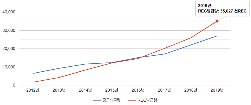 - 2019년 REC 발급량은 35,027 천REC 으로 2019년 공급의무량 대비 29.9% 초과