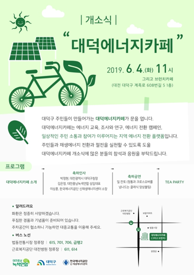 한국에너지공단 신재생에너지센터에서 주관한 ‘2019년 재생에너지 지역확산을 위한 민간단체 협력공모사업(주관기관 대전충남녹색연합, 참여기관 대덕구)’에 선정되어 협력사업 일환으로 추진한 “대덕에너지카페”는 일상적인 주민 소통 등이 이루어지는 카페로 재생에너지 지역확산 플랫폼 역할을 할 것으로 기대된다.