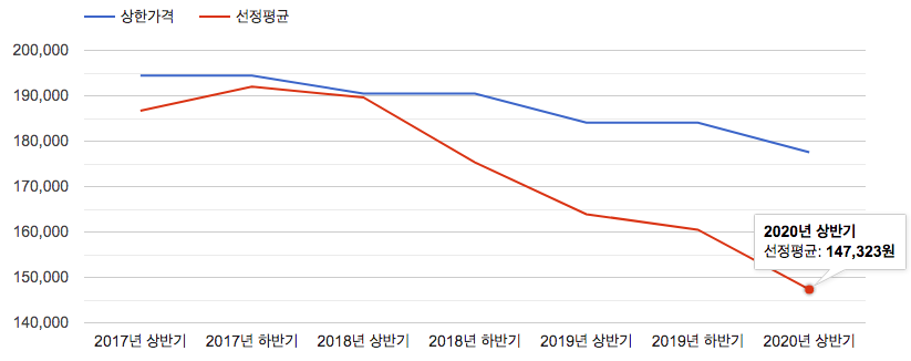 제주 선정 평균가는 147,323원으로 (2019년 하반기 160,499원)