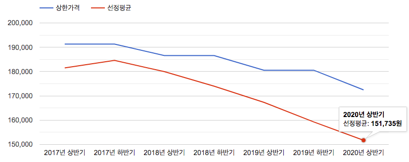 육지 선정 평균가는 151,735원으로 (2019년 하반기 159,267원)