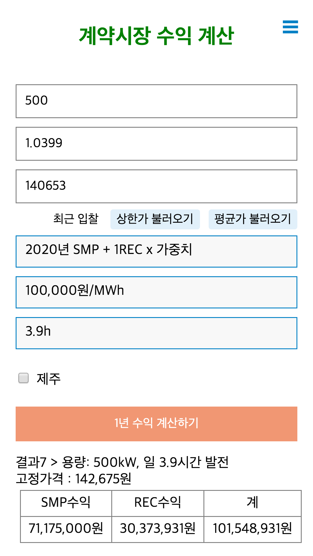 제공하는 기능 - 최근 SMP, REC 기준 수익 계산 샘플 - 일평균 발전시간 계산 (발전소 가동률) - 일평균 일조시간 비교 - 전국 지역별 일평균 일조시간 현황 - REC 계산 (가중치, 발급량) - REC 가중치