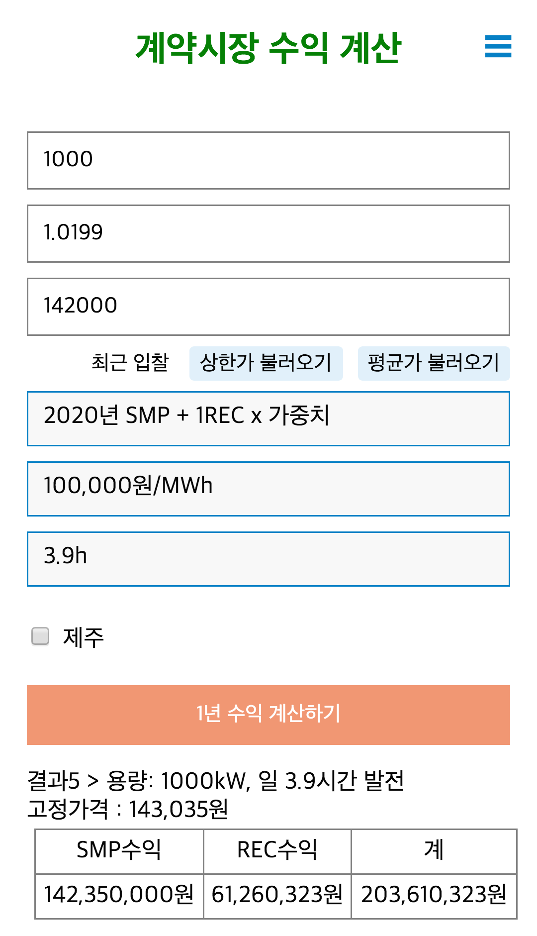 제공하는 기능 - 최근 SMP, REC 기준 수익 계산 샘플 - 일평균 발전시간 계산 (발전소 가동률) - 일평균 일조시간 비교 - 전국 지역별 일평균 일조시간 현황 - REC 계산 (가중치, 발급량) - REC 가중치