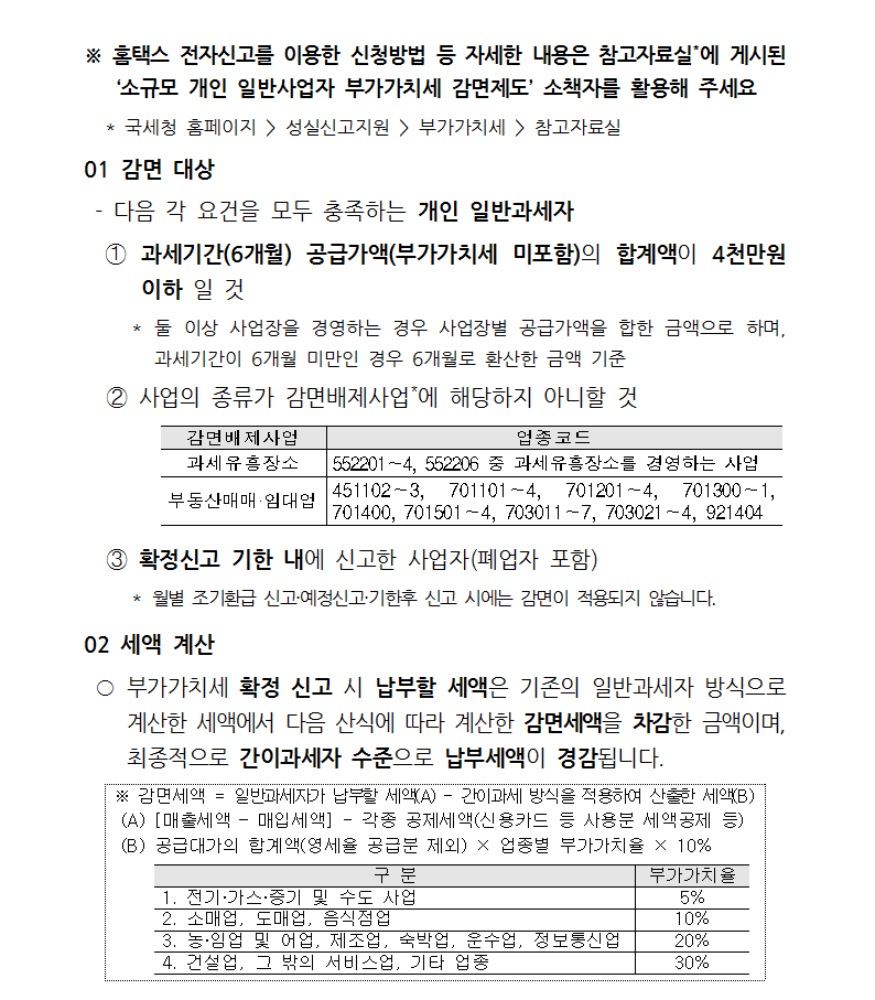 컨텐츠 업데이트 일자 : 2020-06-30 제 목 소규모 개인사업자 감면 안내 ※ 홈택스 전자신고를 이용한 신청방법 등 자세한 내용은 참고자료실*에 게시된 ‘소규모 개인 일반사업자 부가가치�
