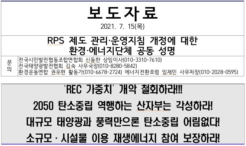 - 산자부는 금번 ‘신·재생에너지 공급의무화제도 및 연료 혼합의무화제도 관리·운영지침 일부개정안’을 철회하고 충분한 의견 수렴 절차를 거칠 것을 촉구한다!