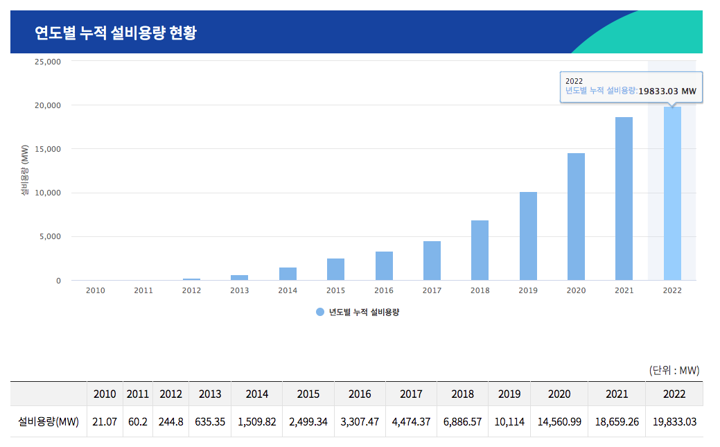 2022년 5월 기준 전국에 설치된 태양광 발전소 설비용량은 19.83기가와트(GW)다.
