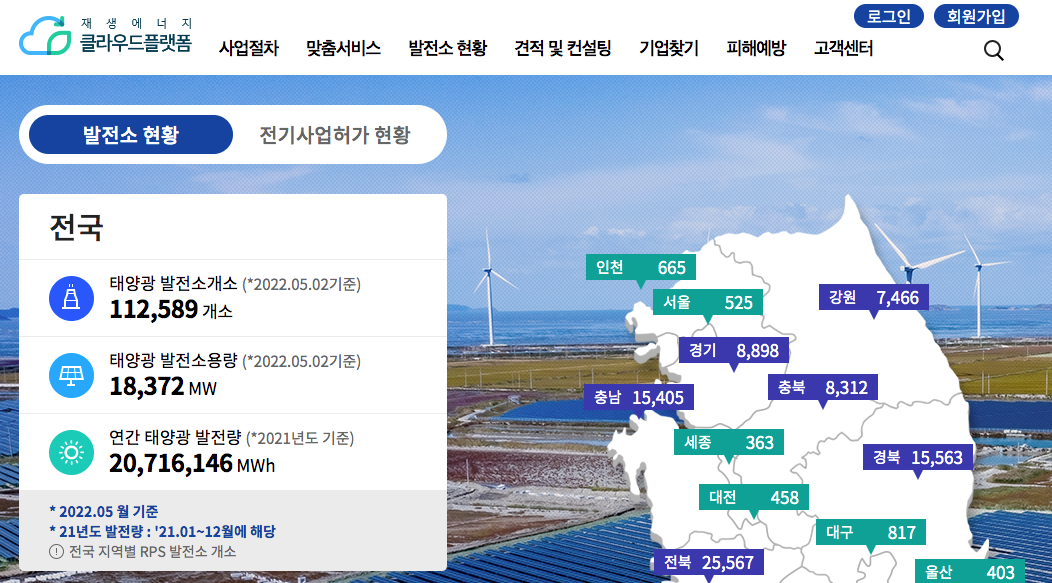 전국의 태양광 발전소 현황을 한눈에 볼수 있는 곳이 있다.