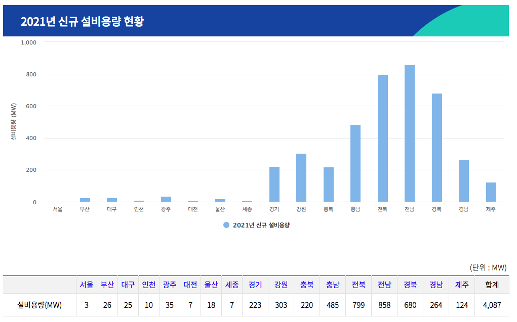 작년 2021년 신규 설비용량을 지역별로 비교할 수도 있다.