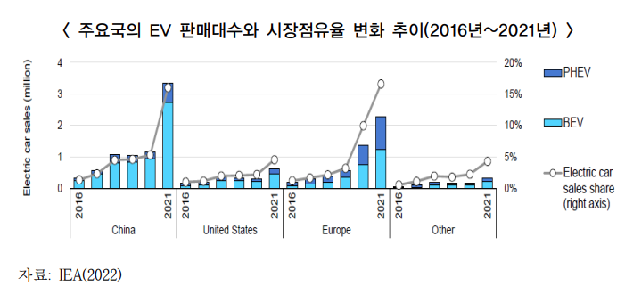 2021년 전세계 판매량 중 중국이 330만대로 절반을 차지하였으며, 유럽이 지난해 대비 65% 증가한 230만대를 보이면서 증가 추세를 주도하였음.