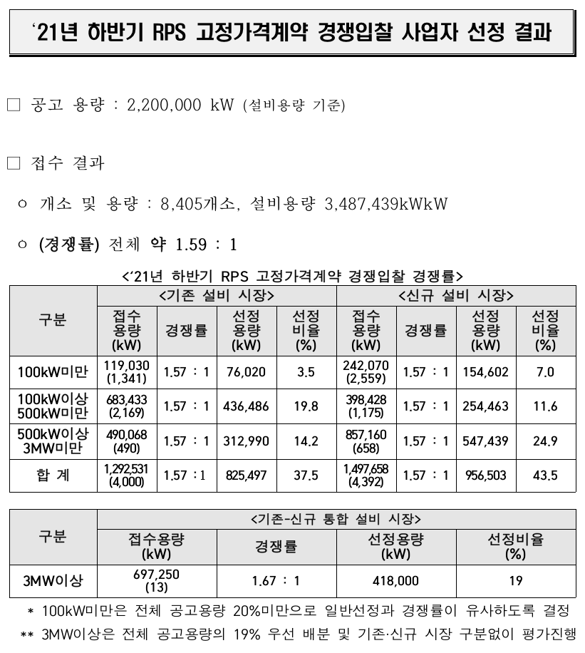 22년 상반기 RPS 고정가격계약 경쟁입찰이 시작되었습니다. 신재생에너지센터 공고문은 아래 링크에서 확인 가능합니다. ↓↓↓ 22년 상반기 RPS 고정가격계약 경쟁입찰 공고 공고 주요 내용 1. 2022년 상반기 입찰 상한 가격입니다. 작년 하반기 입찰 상한 가격과 같습니다. 2. 선정 용량이 줄었습니다. 작년은 2,200,000kW (2,200MW) 였고 올해는 2,000,000kW 로 200,000kW(200MW) 줄었습니다. 3. 선정 평가기준에서 계량평가 > 태양광모듈탄소배출량 평가 배점(10점 -> 15점)과 평가 구분(3개 구간 -> 4개 구간)이 변경되었습니다. 4. 이번 입찰에 응모하기 위해서는 작년 결과를 참고할 수 밖에 없습니다.