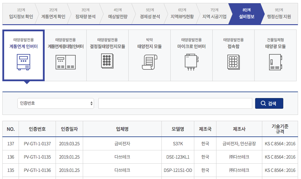 KS 인증을 받은 태양광 모듈, 인버터 등 부품을 확인할 수 있습니다.