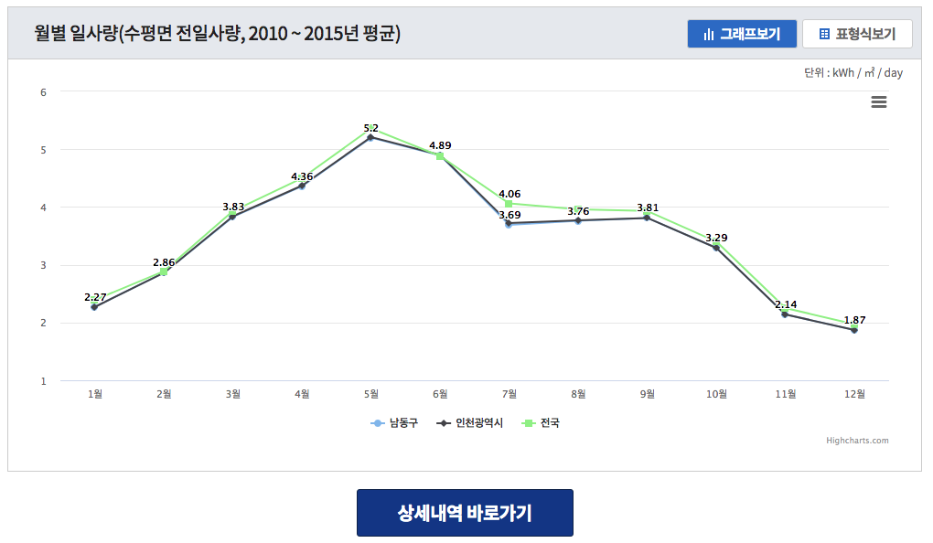 방위별 일사량, 계절별 일사량, 월별 일사량을 확인할 수 있습니다.
